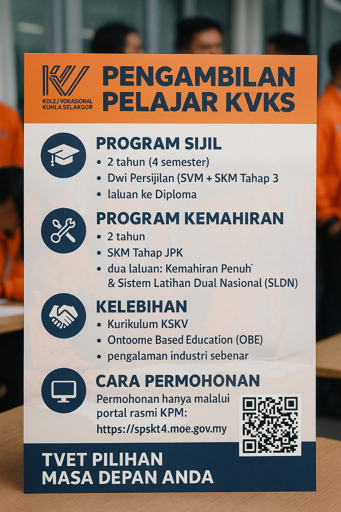 ⚠️ Nota penting: KV Kuala Selangor tidak menerima permohonan terus di kolej. Semua permohonan perlu dihantar melalui portal rasmi ini sahaja.