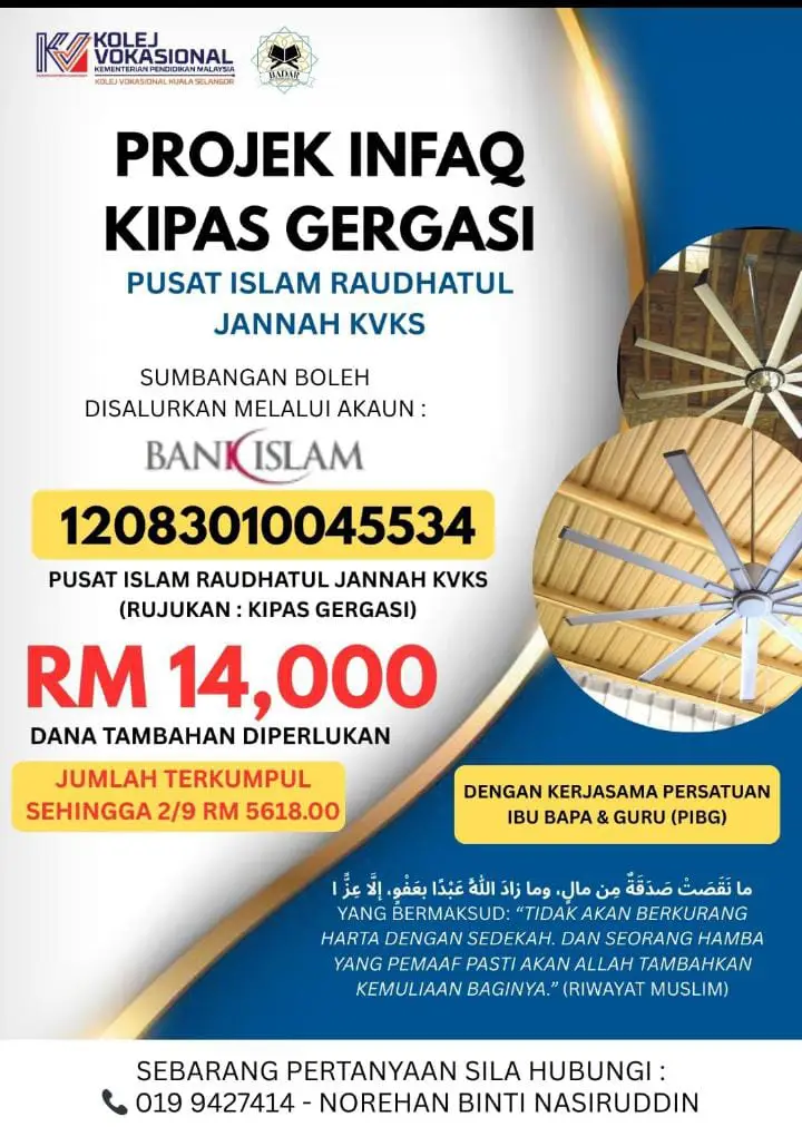 Pusat Islam Kolej Vokasional Kuala Selangor dengan kerjasama PIBG KVKS kini melaksanakan Projek Wakaf bagi membeli dan memasang 1 unit Kipas HVLS (24ft) di Pusat Islam Raudhatul Jannah.